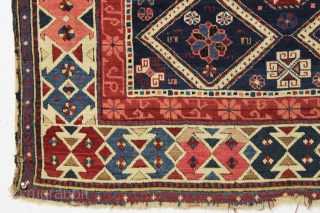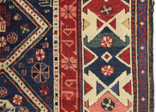 Antique seichour kuba rug with an interesting border. Near original condition with overall good thick pile and excellent tight weave. All natural colors including a beautiful old pink. Ends a bit unraveled and very slight corner and selvage roughness as shown. Easily restored to perfect. Recent wash. 3rd qtr. 19th c. 3'5" x 5'7"