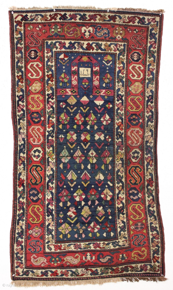 Antique dated small caucasian prayer rug featuring a terrific main border. Good condition with full thick pile. Wide range of good natural colors including at least two shades of insect cochineal along with a strong madder red. "As found", dirty, and i believe with some areas of acceptable older repair. 19th c. Nice small size. 2'9" x 4' 10"