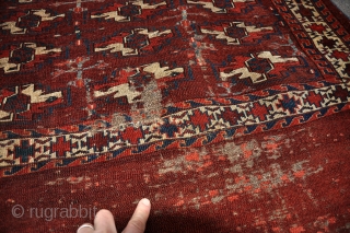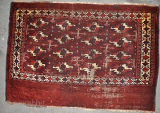 Antique Yomud group Chuval with oodles of offset knotting, a classic salt and pepper back and rich colours. There is some very fine cotton in the wefts. Some wear, slight staining in corners but clean and floppy with no odours or other hidden problems. a very charismatic example for not too much money. 1st half 19th century.