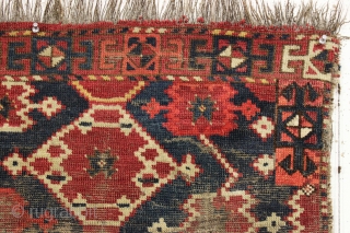 Antique ersari chuval. Large scale ikat inspired field design with a bold boreder and interesting elem panel. All natural colors. Bristly warps, probably goat hair. Creases, sewn tears, wear and assorted roughness as shown. Not for everyone for sure. Good age. ca. 1860. 2'8" x 4'
