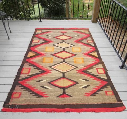 Rug-Pickers find as found: a 1920's to 1930's 5x8.5 Navajo rug with some holes and some fraying on the edges, but overall in good condition. Thanks for looking.