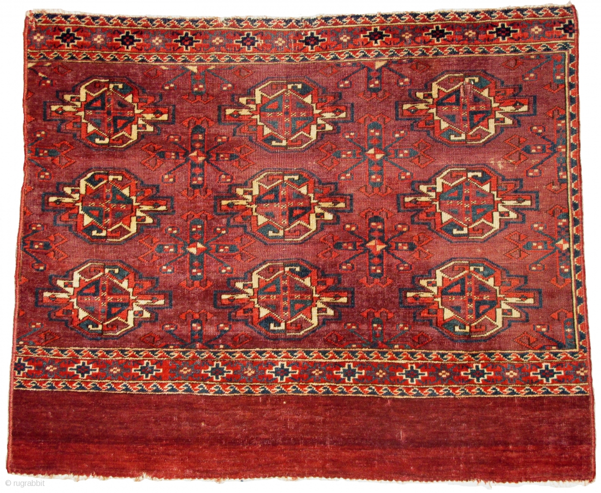 Turkmen Chuval, probably an early sub-group of Yomut with great drawing including exceptional minor guls of a type more generally found in Eagle Group pieces. Note how nicely the guls and minors are articulated and how they line up with each other to form a very strong lattice. Wool is supple and velvety and the weave is quite fine as can be seen by the back. Sides are cut but pile is good. 32"x27"