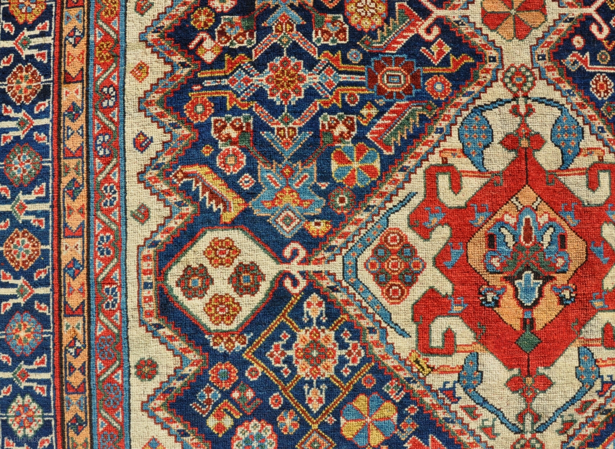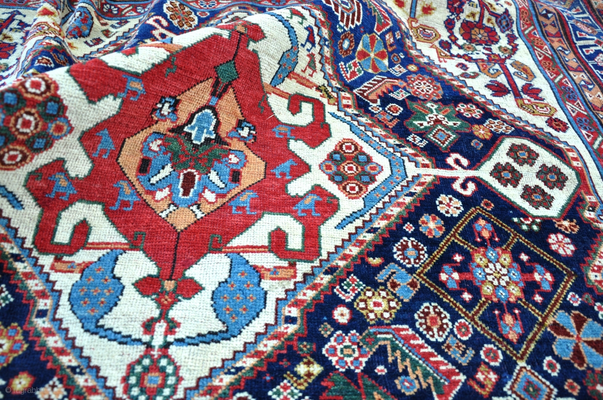 a very good antique Qasgai carpet. Great wool and colour, bigger than usual and beautifully drawn. Mainly in full pile, small amount of top flight repiling to frayed end, otherwise original condition. Circa 1870. 287x168cm