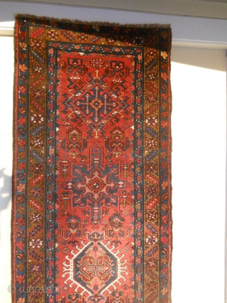 Karajda runner - about 17.6' x 3' overall good pile with some moth nibbles. Nice drawing with some animals about. Upper end overcast into secondary border and missing about 2 inches of selvage on one side of upper end.
