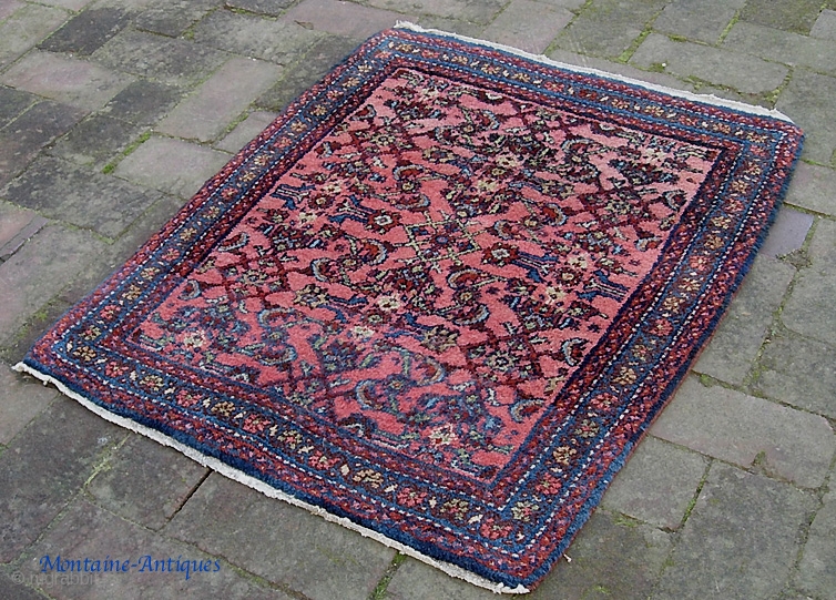 Mehriban Pushti. 2 ft 1 inches by 2 ft 8 inches. Thick and plush little Herati rug with soft salmon field. Weave is above average for Hamadan region; nicer quality wool. Condition is near-mint. Add $15 for us shipping