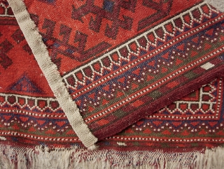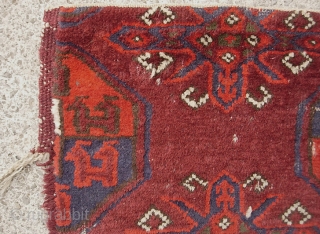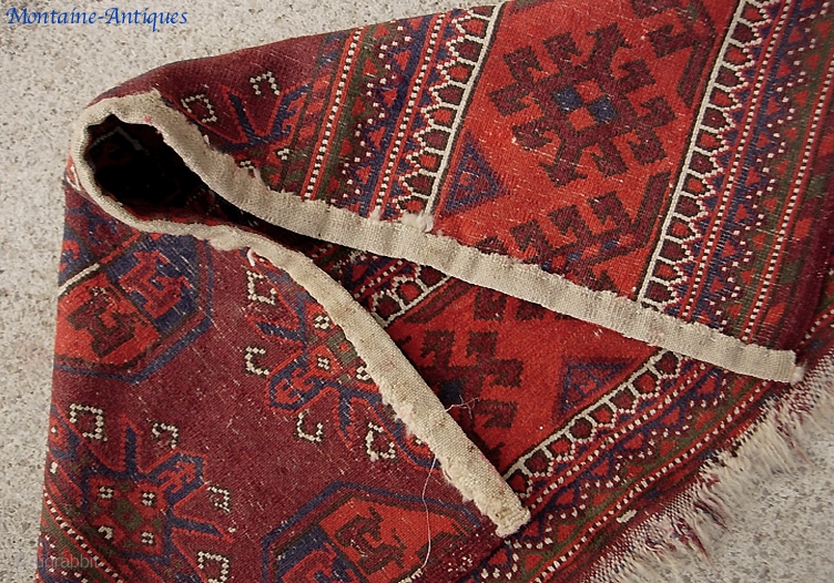 Beshir Torba 38 inches by 22 inches. At first glance this looks like a corner fragment of a carpet size rug. But it is actually a large Beshir bag face. Confusing because it appears to have remnants of triple selvedges on both sides. What happened is that it originally had two Tauk Nuska guls. It has lost part of one gul plus the left borders. Then-- someone (a long time ago) meticulously rewove the selvedges. Fragment that it is, still a very interesting and finely made old Turkoman textile for not a lot of dough. $15 us shipping.