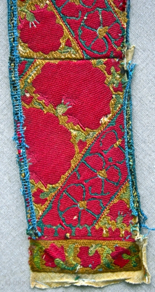 a very good circa 1850 Karakalpak (Uzbekistan), silk embroidered sash, that was used in a headdress. Silk on cotton, and it was originally made like this, woven in short strips and sewn together. This particular one i i sourced from a friend from Kabul back in 1976 and have had it ever since. Somewhat rare; i haven't seen a good old one on the market in the last few years. it has very fine stitching and excellent dyes.....