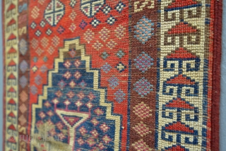 Early Armenian Yastik fragment with great colors including insect cochineal and apricot dyes. 18 x 28 inches.