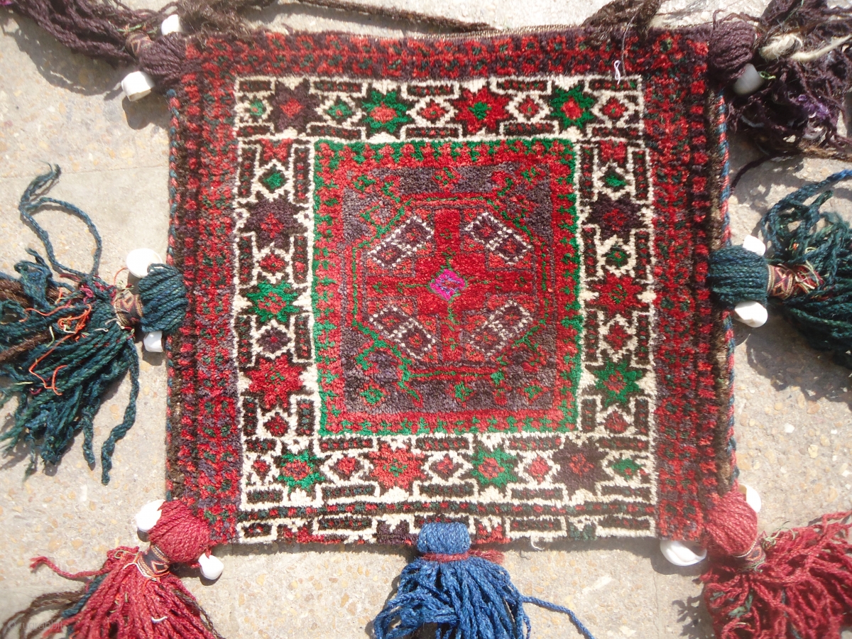 Double Sided Piled Baluch Bag with all orginal tassels,all good colors,soft shiny wool.nice desigen.Size 1'3"*1'2".E.mail for more info and pics.