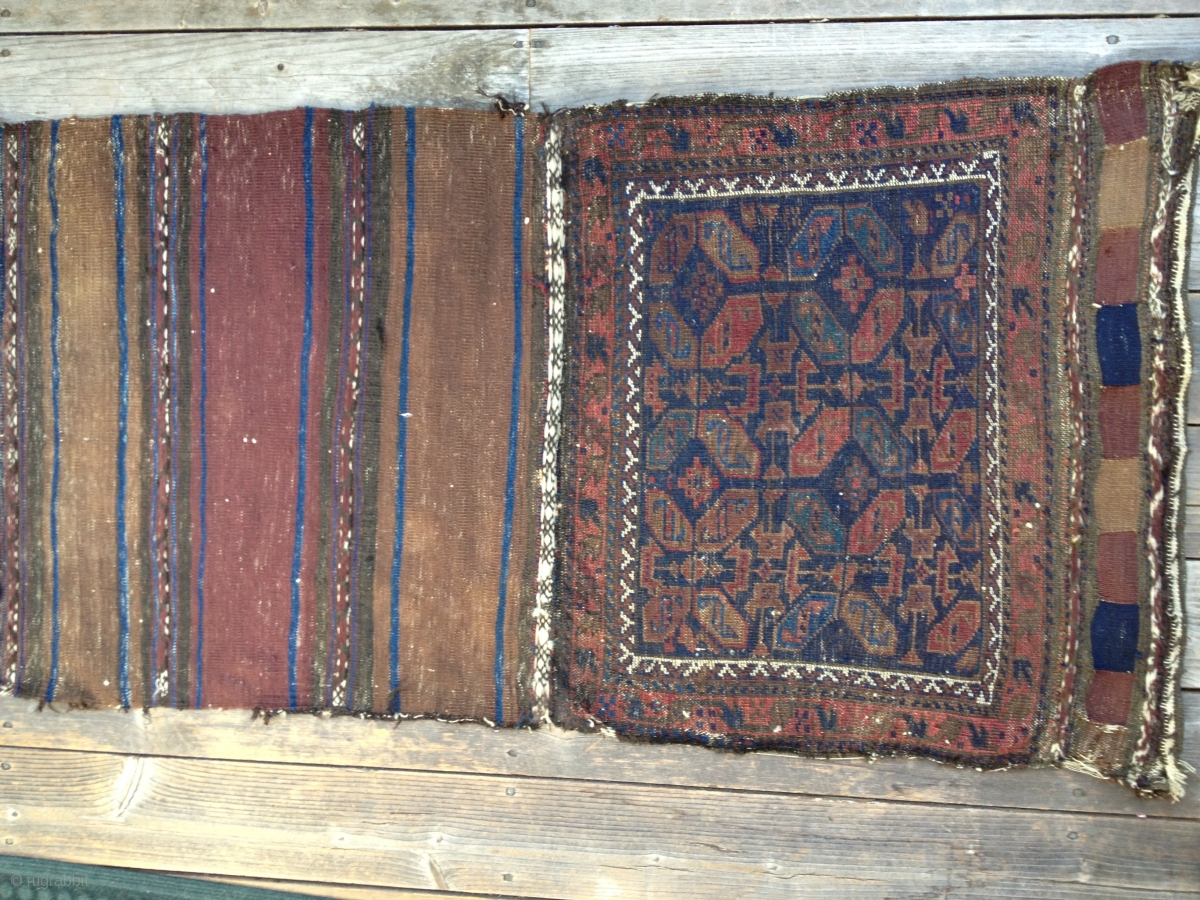 Early Antique Baluch Bag. Complete, with good colors including outstanding blues. Archaic and unusual design. Low pile with some oxidation and some fraying on sides and ends. Nice striped kilim open back. See photos for details. Price reduced. Size 27 x 26in. closed, 57 x 26in. open. Last photo is the back of the bagface.