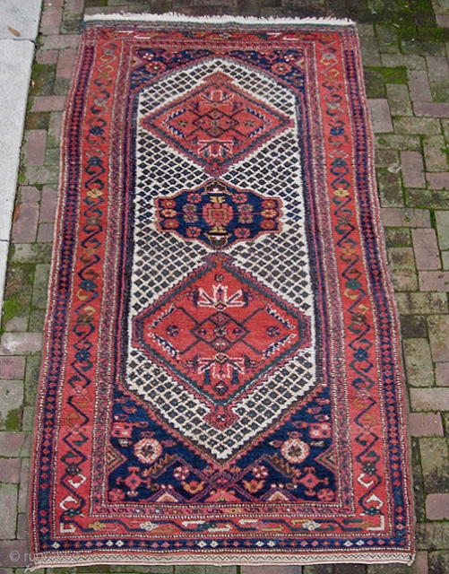 Kurd 4 ft 6 inches x 8 ft 10 inches. Useful size. Very lively and decorative with diapered white field. Somewhat coarsely woven w/ heavy thick pile; charming and vernacular. Excellent condition w/ full thick pile and original sides and kelim. $20 us shipping.