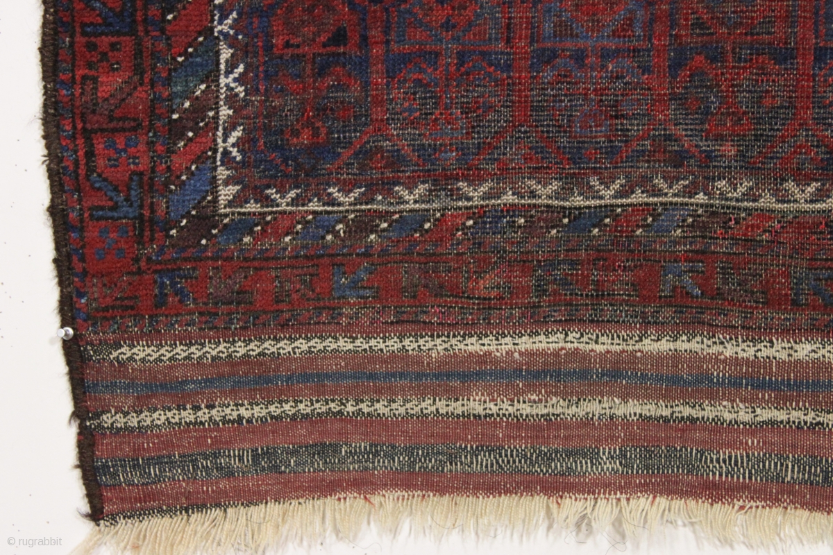 antique baluch prayer rug. Unusual design. all natural colors with nice light blues. no repairs. Nice long kelim ends. small squarish size. 19th c. 3'3" x 4'3"