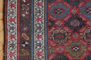 antique kurd bidjar long rug. Interesting and unusual field design. All natural colors. Pile varies from decent medium to low with foundation peeking. No repairs. a charming floor rug, a bit rough but priced accordingly. All wool. Thick and heavy. Could stand a wash. late 19th c. 4'1" x 9'6"