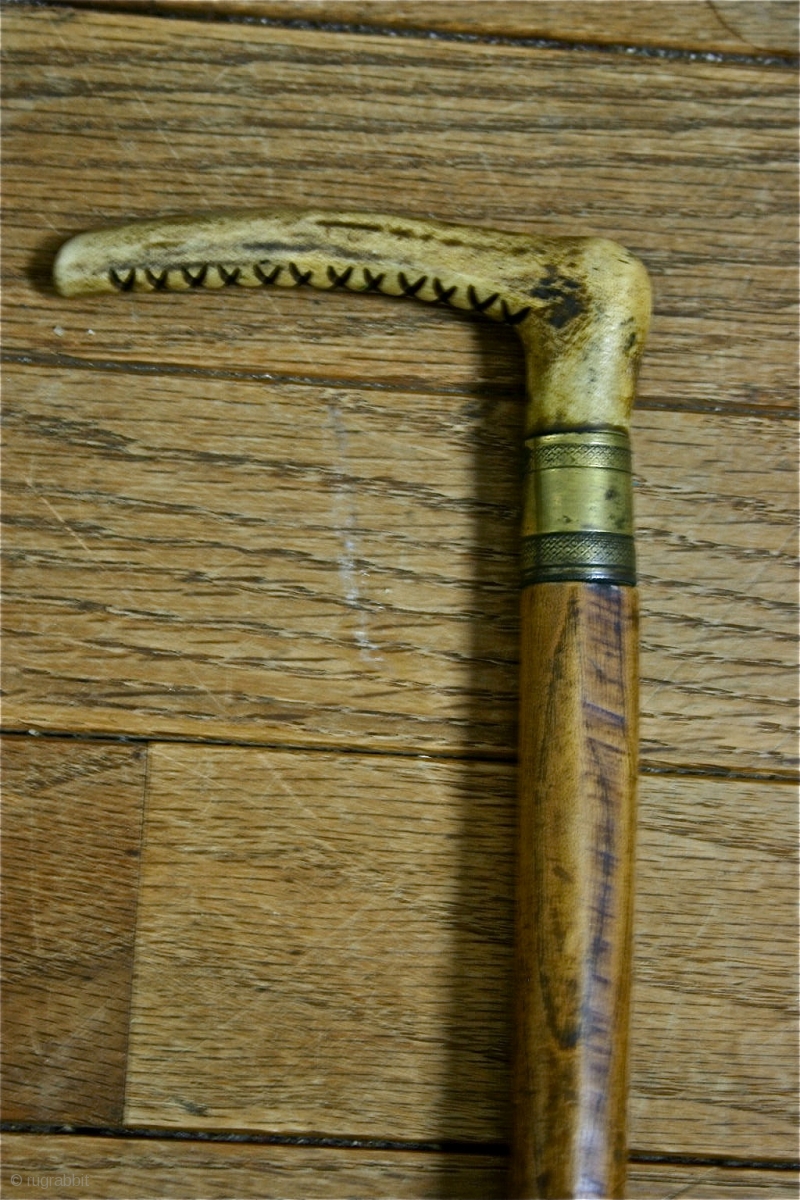 This is an old Buzkashi whip, most likely 19th c., carved from one shaft of wood into 4 separate bent wood braided branches; it is completely hollow in the center. The carved horn or antler handle at the top shows serious wear, attesting to it's age. It is attached to the whip by a hand engraved brass ring. The leather flap at the bottom is wrapped by some kind of natural fiber woven cord. It has a few small cracks at the handle hilt as it was many an Afghan who was smacked across the brow or hands in a game of Buzkashi. The horses were hit a bit less! ;-))