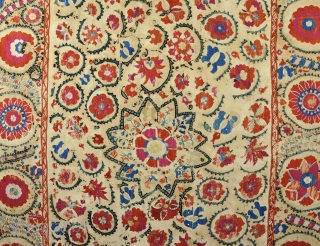Antique Suzani, some rubbed areas and damage to linin ground, but professionally conserved and backed. Mid 19th century.