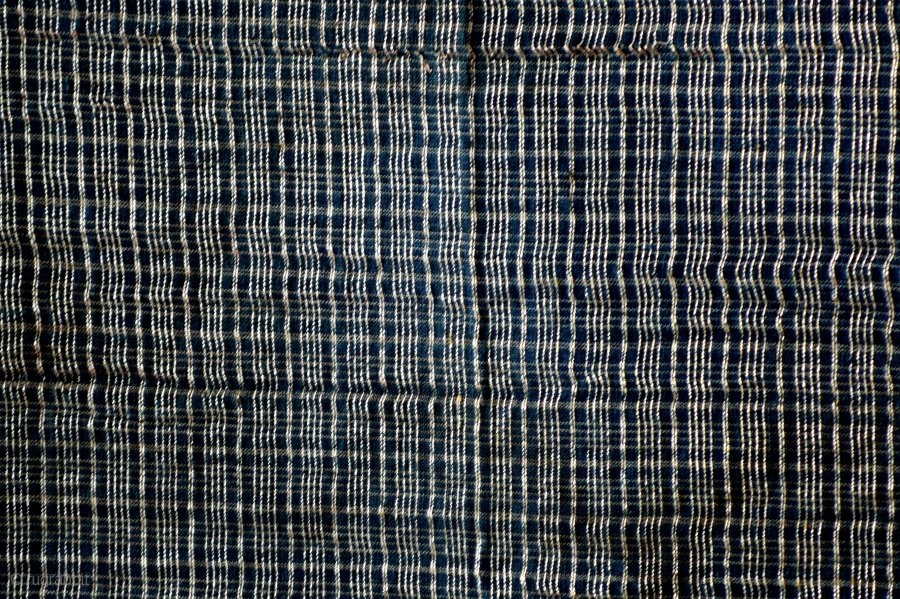 The first piece shown here is densely staffed with silver threads as supplementary weft which make the textile stiff and heavy. The textile consists of two panels which are meticulously joined by hand. The basic material is blue and red natural dye and handwoven cotton fabric.