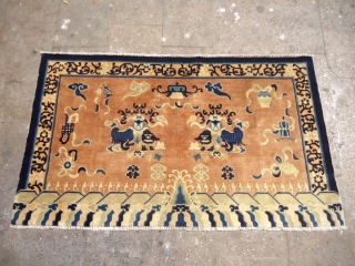 Tibet or Chinese seating rug with two dragons in the middle and beautiful design,fine weave,all good colors and fine weave.Good age,Size 5*3ft.E.mail for more info and pics.