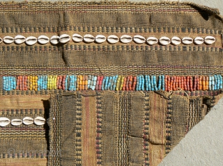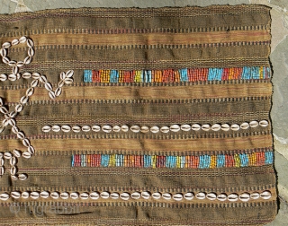 Old Naga Bodywrap Skirt. From Nagaland, in the extreme ne of India. 48 x 21 inches. The textile is handloomed heavy cotton material with stripes and supplemental weft designs. The skirt is embellished with designs in cowrie shells and strips of tiny colored glass beads. The skirt is in good condition though it is dirty. Most of these Naga textiles i find are a bit dirty from rough use. This is an excellent uncommon textile from a remote part of the world. More Naga items just added www.banjaratextiles.com
