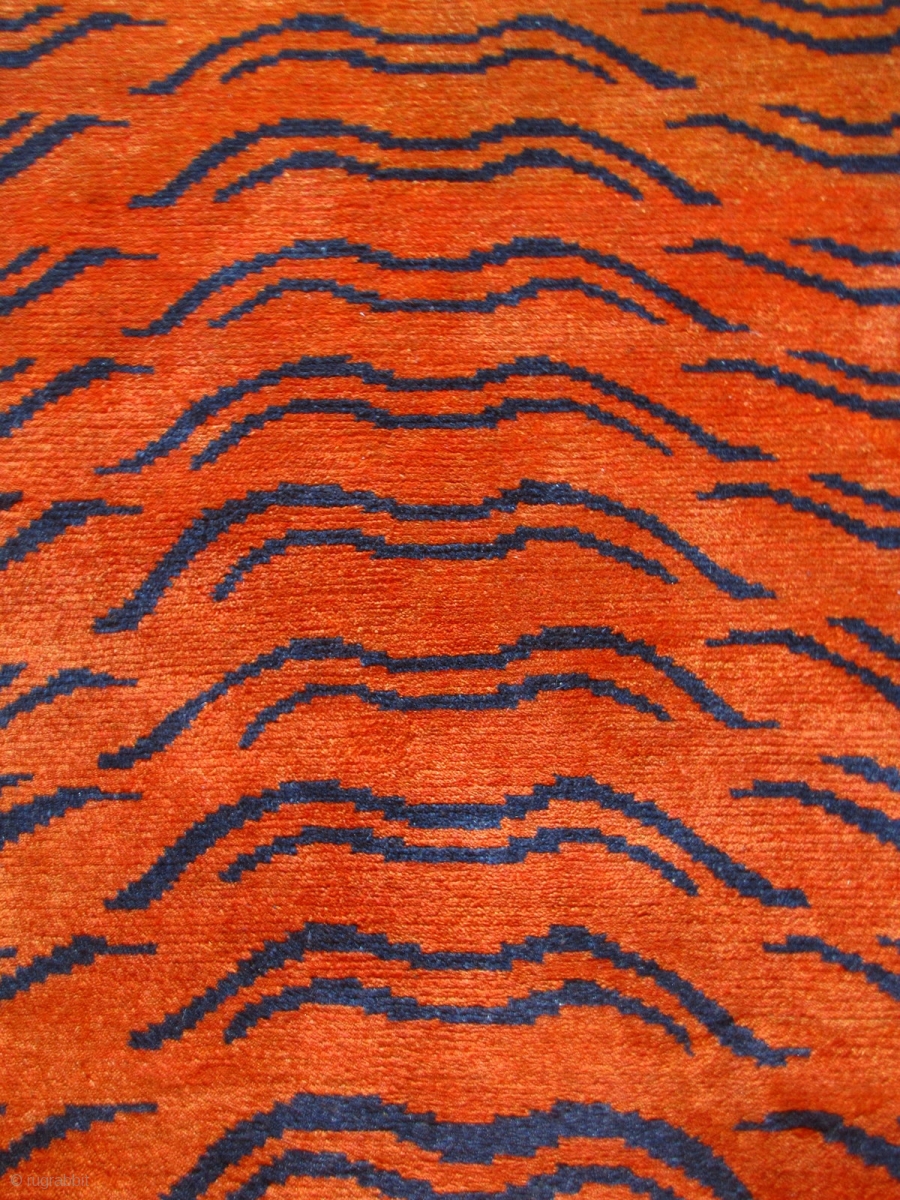 Tiger rugs are particularly associated with tantric meditation and historically were woven as a gift for lamas in a monastery. In a religious context Tiger rugs are related to the tiger skin loin cloths seen in painted images of fierce Tibetan Buddhist gods and are believed to provide protection to a person engaged in meditation.