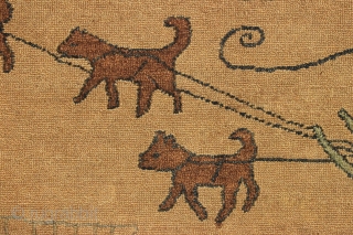 antique grenfell mat. Pretty little pictorial example found in New England. Reasonably clean with a small area shown that could use a little repair. early 20th c. 19" x 32"