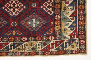 Antique very colorful little caucasian rug in good condition. Eye catching "dragons tooth" border. All good saturated natural colors featuring beautiful greens, multiple blues and nice old yellows and golds. Original selvages. a bit of scattered repiling and i see a small old thumbprint size crude repair in upper corner. Clean and ready for wall display or light floor use. ca. 1875. 3'8" x 5'