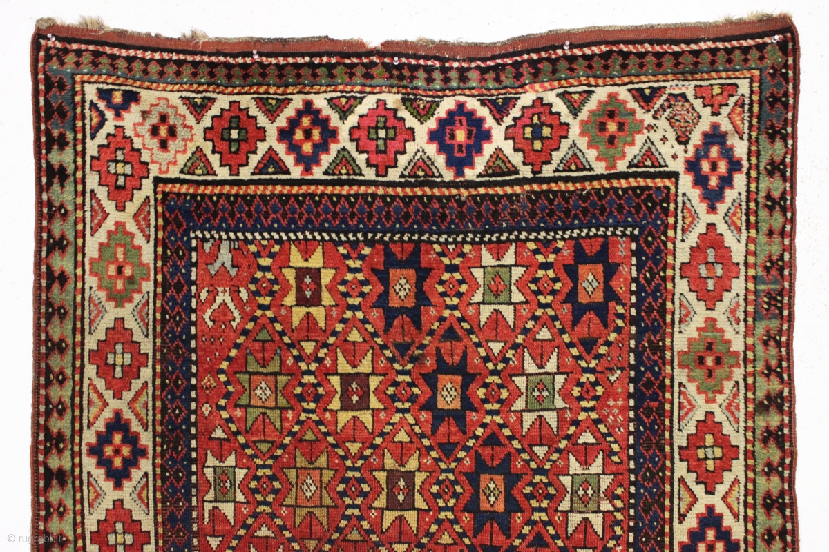 antique kazak rug with an interesting allover design and a wide range of beautiful colors. "As found", in mostly good pile with a few small creases (you can see an old crude attempt to repair a small one in close pic). All natural colors including ample greens, a good purple (pics shows back of unfaded purple), and a fine old natural orange. Few small spots of dirt, will need a good cleaning. Easily restored to excellent condition. ca. 1880. 4'2" x 6'3"