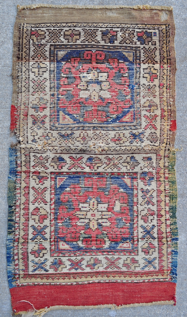 Bergama Heybe bag faces jointed to make a Yastik size rug. 19" x 33" - 48 x 84 cm.