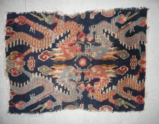 small tibetan mat with a dynamic design made of four edentate dragons. it has been apparently used as saddle top , as the wear on both sides indicates. early 20th, 56x 80cm.