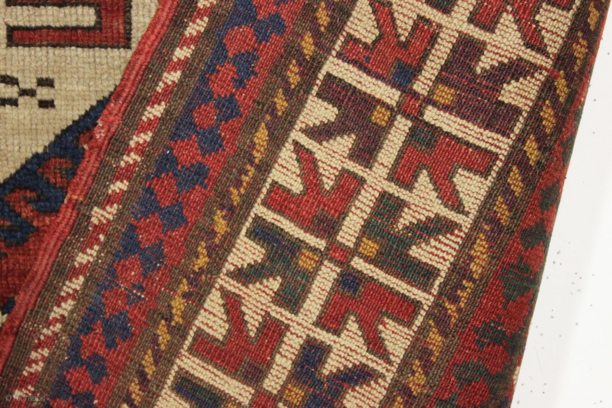 large early lori pombak kazak with crisp drawing and excellent color. "As found", very very dirty with even pile, original selvages, some scattered wear and light corner staining as shown. i don't see any repairs. All natural colors featuring lots of beautiful purples and nice old yellow highlights. a fine candidate for restoration after washing. Good age, 3rd qtr. 19th c. 6'2" x 7'3"