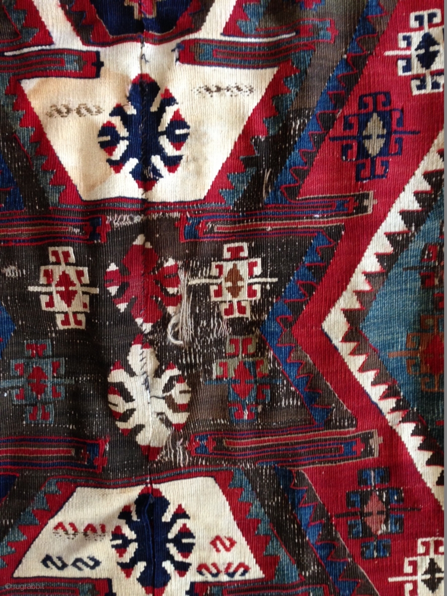 Anatolian kilim, Kurdish region, with nice saturated colors, not in perfect condition with some wear and tear. Both cotton and wool white, a nice madder red is used as well.