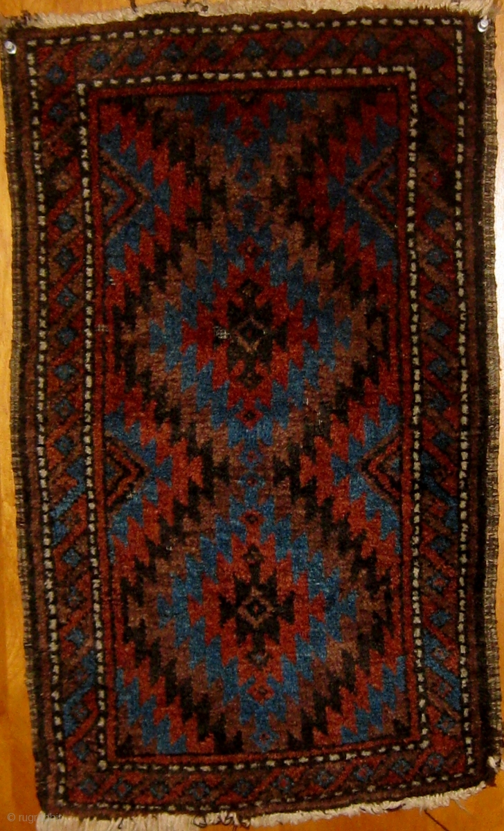 Antique small Baluch balisht, circa 1900, all natural dyes including a wonderful light blue. In good condition, soft silky wool,mostly full pile. 28" by 16". Please ask for additional photos.