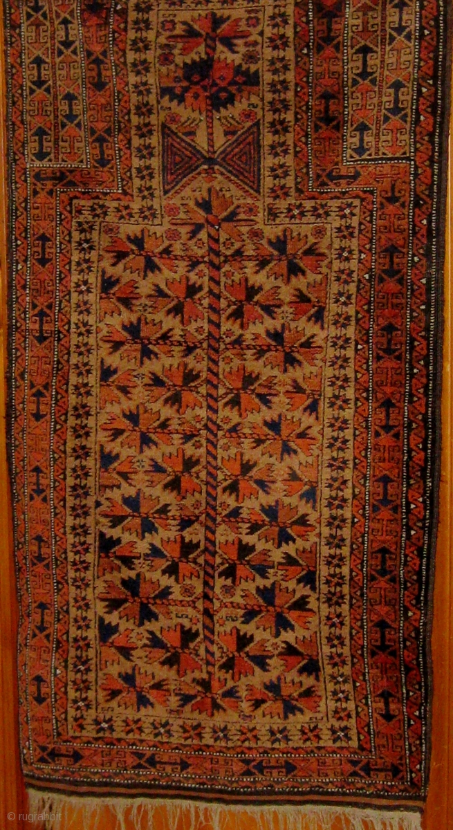 Antique camel ground "tree of life" design Baluch prayer rug, in near pristine condition. Original ends and sides. All dyes natural. 34" by 65". Circa 1890-1900. Please ask for additional photographs if needed.