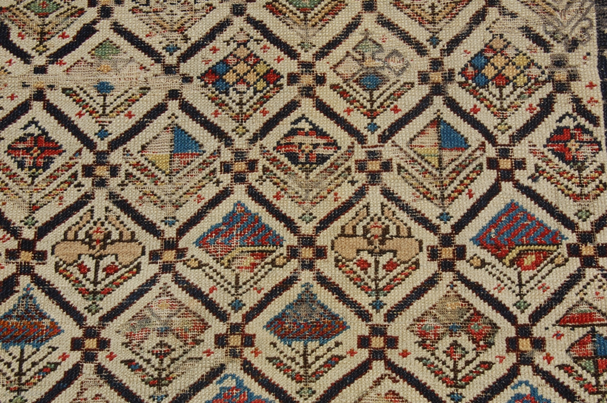 Mounted/size of the linen support(Full size): 110 x 182cm (size of the rug fragment: 100 x 172cm). 19th century, i was told over 150 years old. Provenance: The rug had an old jerrehian brothers, rugs of quality, philadelphia cloth label on the back sewn into the rug. It was bought originally from the us, then brought to Turkey, where it got backed and conserved.