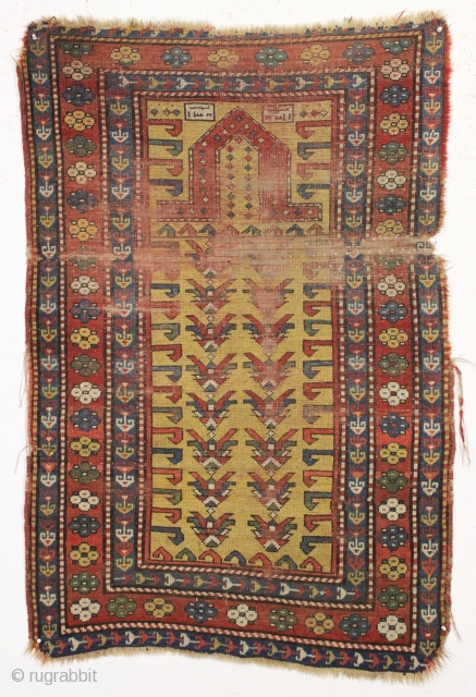 Antique small yellow ground kazak prayer rug. Interesting design. All natural colors. "As found", very dirty with wear and damage as shown. Priced accordingly. Good age, ca. 3rd qtr. 19th c. 3'3" x 4'10"