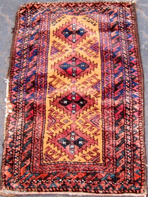 Antique Baluch balisht complete with original flat-woven back, full pile, all dyes appear natural, beautiful condition except for a side bite, original edge work, 19" by 31". Please ask for additional photos.