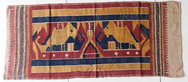 Tatibin ceremonial cloth Lampung south Sumatra Indonesia, Paminggir people cotton natural dyes supplementary weft weave, with ship motif and mythical animal motif, good condition, 19th century size: 96 cm x 41 cm. Tatibin is small version of Palepai ship cloth for ceremonial occasion.