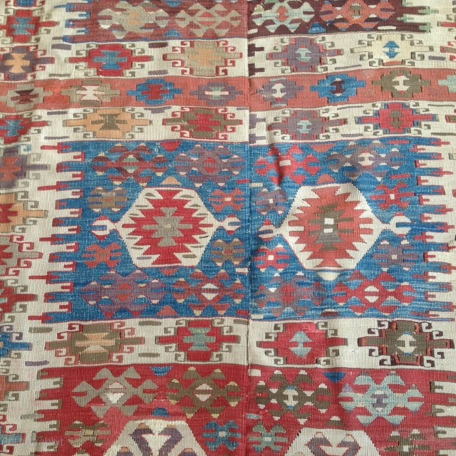Turkish Kilim @ 5 x 11 mid 19c two pc-matches up well. old pastel colors including a soft purple significant older pro restoration- good color match but wool difference is detectible.