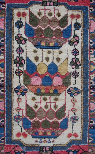 Saveh area Pomegranate rug-- 2 ft 8 inches x 4 ft 0 inches. As we all know, the world's best pomegranates come from the Saveh region in west Persia. Bright cheerful rug in nice thick plush condition. Slightly wider at one end. Aside from this, no apologies. Approx $20 For us shipping.