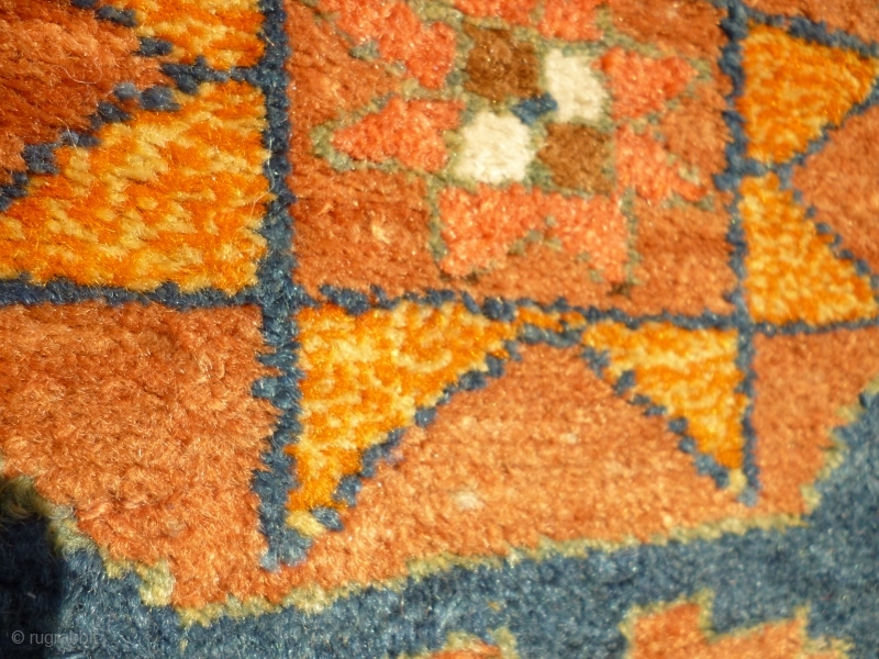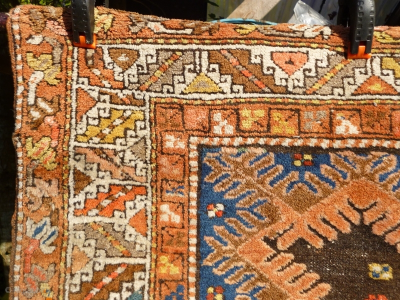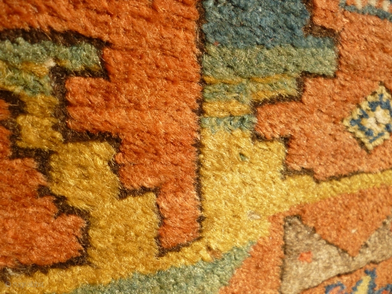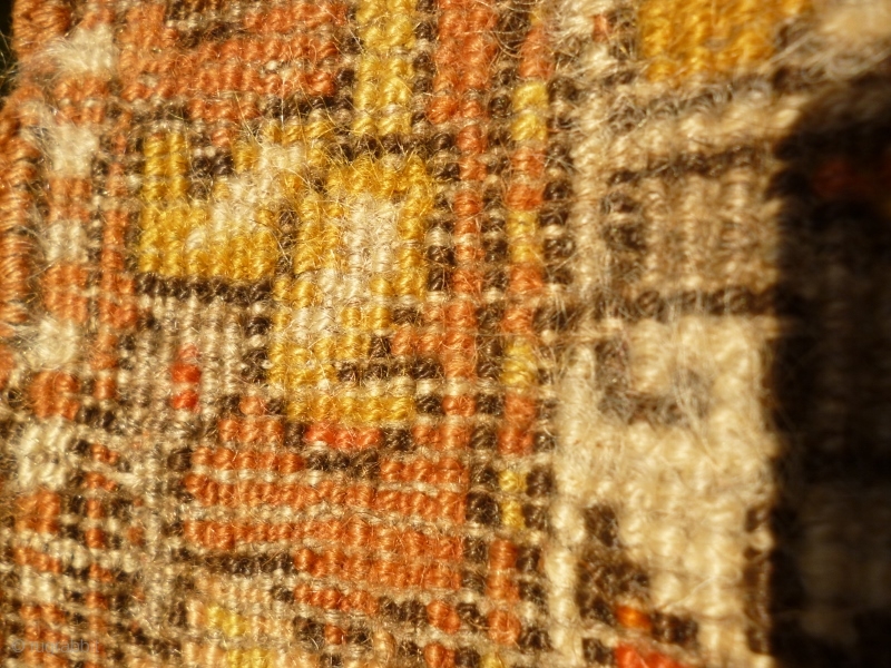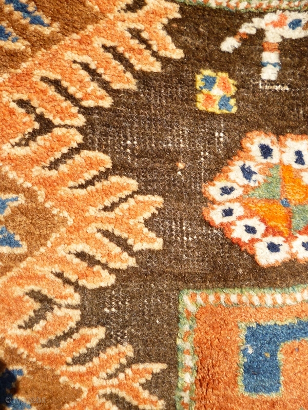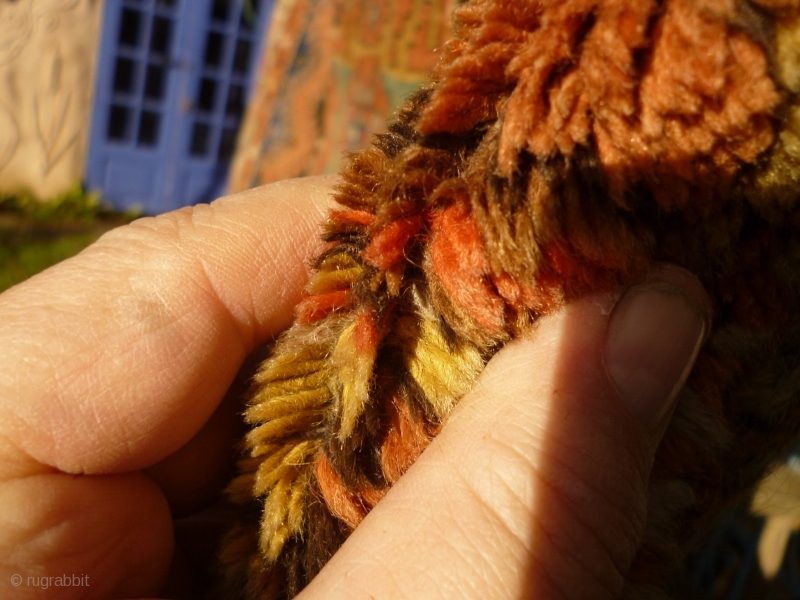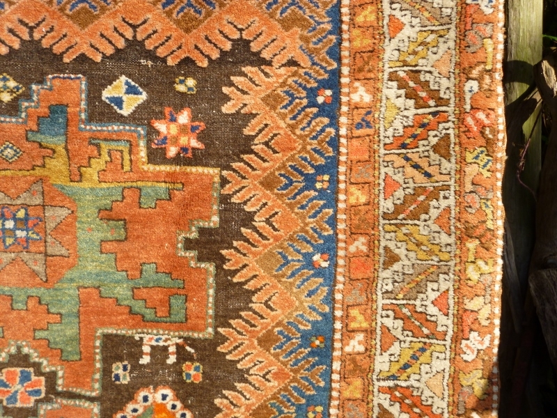 Pure wool with braided top edge and depressed warps. No repairs or restoration. Thick pile, excepting brown/black field. a sturdy rug with wonderful saturated colour and a broad palate.