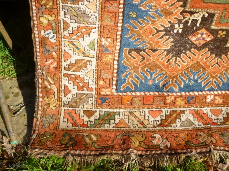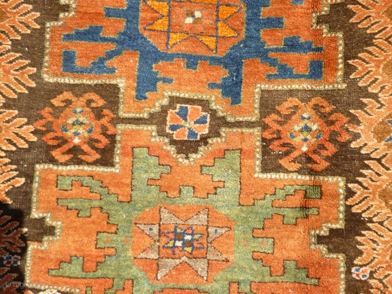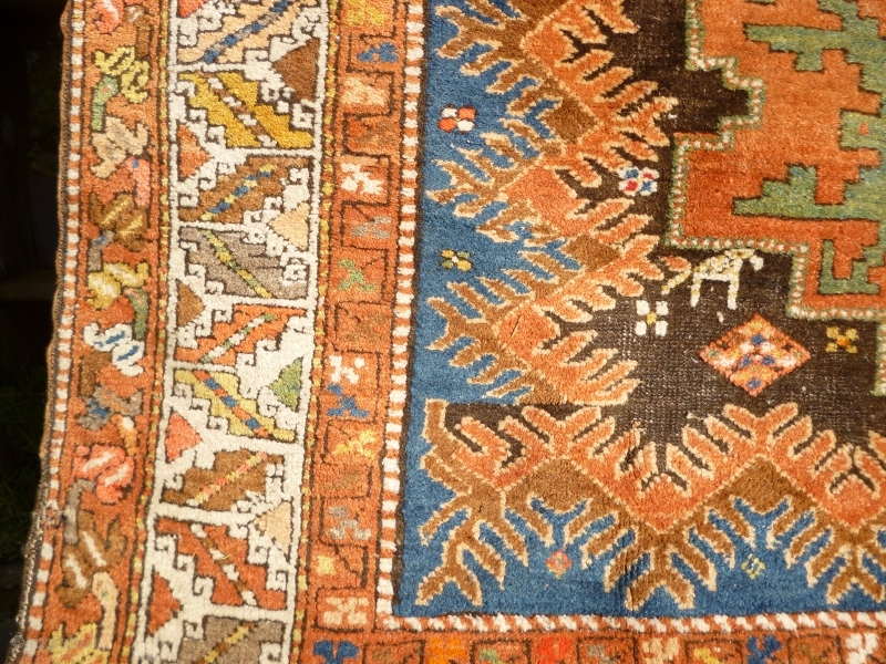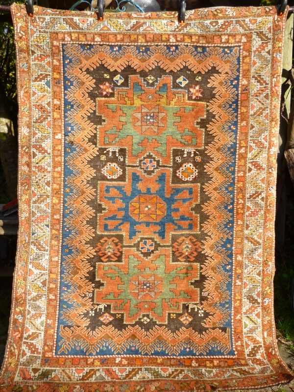 Funky Early 20th Century Caucasian Azerbaijan Rug with Lesghi stars and zoomorphic figures. Great colours, good shape and size. Acceptable condition - minor issue with selvedge lower left, see photos. Not unattractive corrosion to brown/black main field. a few 'hot' colours but this is the d c Comics of tribal rugs and, as such, can be used in a variety of ways: to furnish your home on the floor or wall and as an investment!