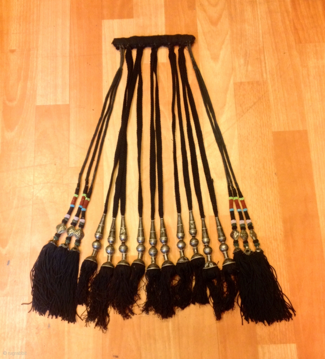 ”Segusha”( Triangle) is a decorative embellishments, whose function, was to decorate the beddings tucked away folded against the walls of a yurt or tent. These objects made with great care were attached on the corner of squarish textiles and used as covers . The silk tassels with beads and metal work are charming and they could be used the way they are as wall hangings, garmets such as belts and could be a great touch onto a shawl or belly dance costume as well as a material source for ethnic jewellery designers.