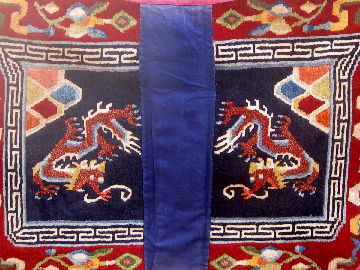 Antique butterfly-shaped Tibetan saddle cover or rug, dragons and mountains on a deep blue field in a spare design usually associated with earlier examples. Early 20th Century. Traditional red edging (faded) and blue cloth backing. Mostly good condition (some wear on the right edge which has been partially masked by a piece of sewn ribbon). For similar examples, cf. "Temple, Household, Horseback" plates 35-37. Please ask for additional photos.