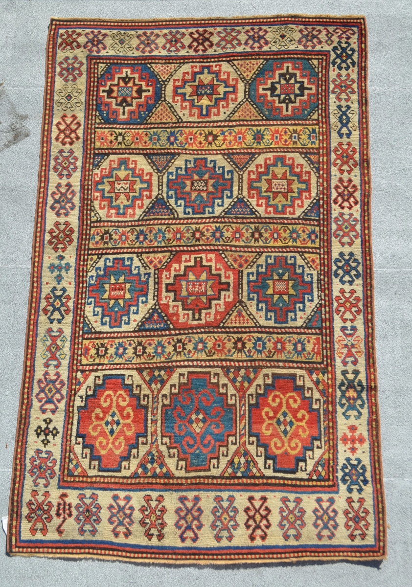 An early Moghan? Kazak. It has some very subtle repairs. 4'11" x 7'11"