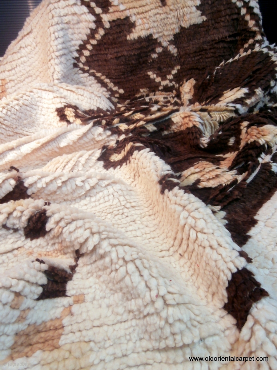 moroccan high atlas berber rug a gifted weaver has created an almost 3 dimensional look by contrasting central medallions of deep charcoal with lustrous undyed white wool in the field. There is minor use of a very light apricot highlight. This rug is from the region of Azilal in the foothills of the High Atlas, east of Marrakech. Reference 2553. Size 227 x 142cms. 7ft.5in. x 4ft.8in. Euros 865.