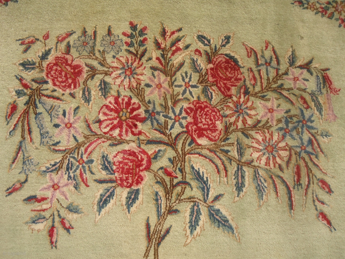 Pistachio Ground Kerman Pushti,all good natural colors,fine weave and very beautiful design.Excellent condition.Soft shiny wool.Size 3'8"*2'7".E.mail for more info and pics.