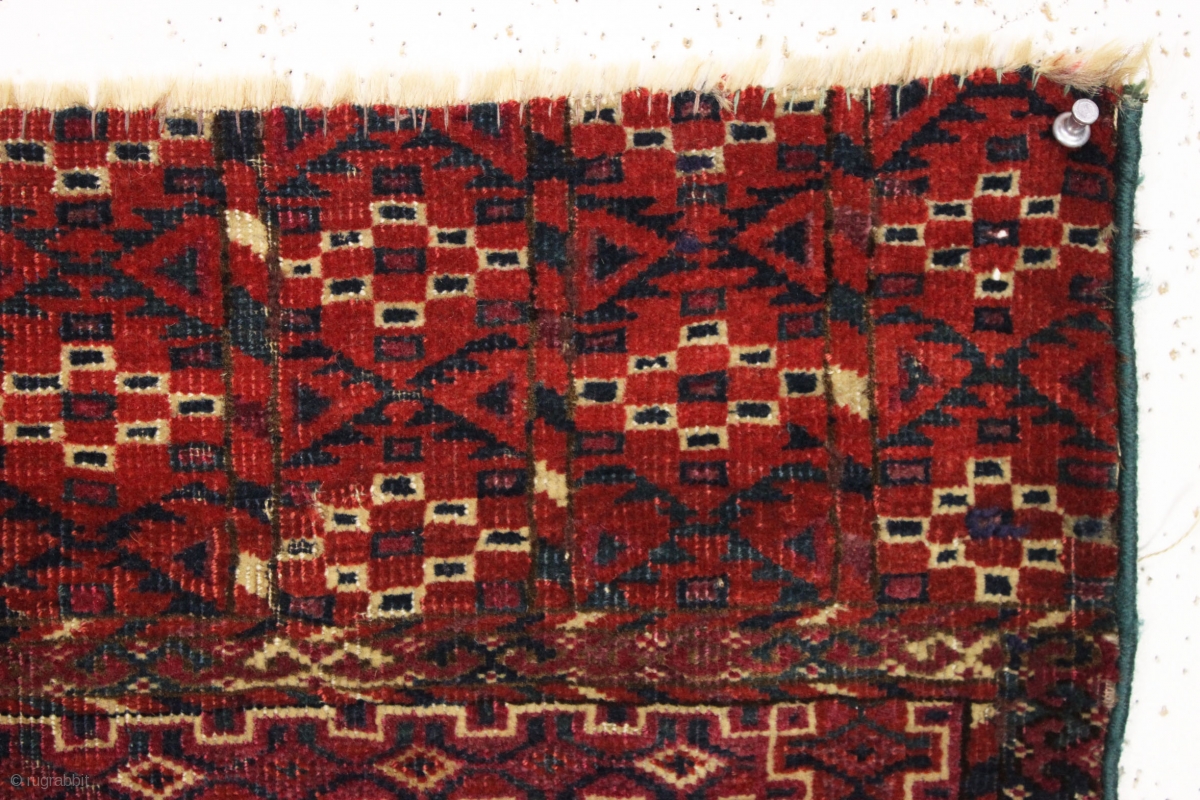 antique little tekke rug with interesting aina gul field and very nice elem panels. All natural colors and fine weave. Overall thin with even low pile. Looks like few original cotton or silk knots. Uneven field color more of a photo effect than in real piece. Scattered old very small repairs. Recent wash. Good age, ca. 1880 or earlier. 3'11" x 5'1"
