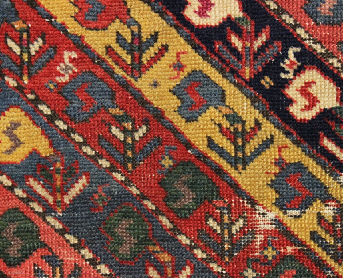 early little caucasian rug with some unusual design elements and splendid color. High quality wool with all natural colors featuring multiple reds, deep greens, fine old purples and beautiful yellow highlights. Never seen one quite like this. Washed. Easily restored. Great size. Good age. ca. 1860. 3'4" x 4'3"