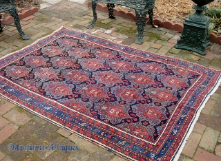 Afshar 4 ft 5 in by 6 ft 0 in. An old and blingy looking tribal rug. The pile is good throughout. Someone must have really liked this rug because they spent at least $500 to reweave both entire ends just to restore the very outer guard-- ie., 3 rows of knots. Note the side cords and remnant overcasting is original almost all the way down. There's another linear repair near a corner shown in the photos. i show you the back because the repair work is excellent and invisible on top. Good retail piece. $20 ups shipping, lower 48.
