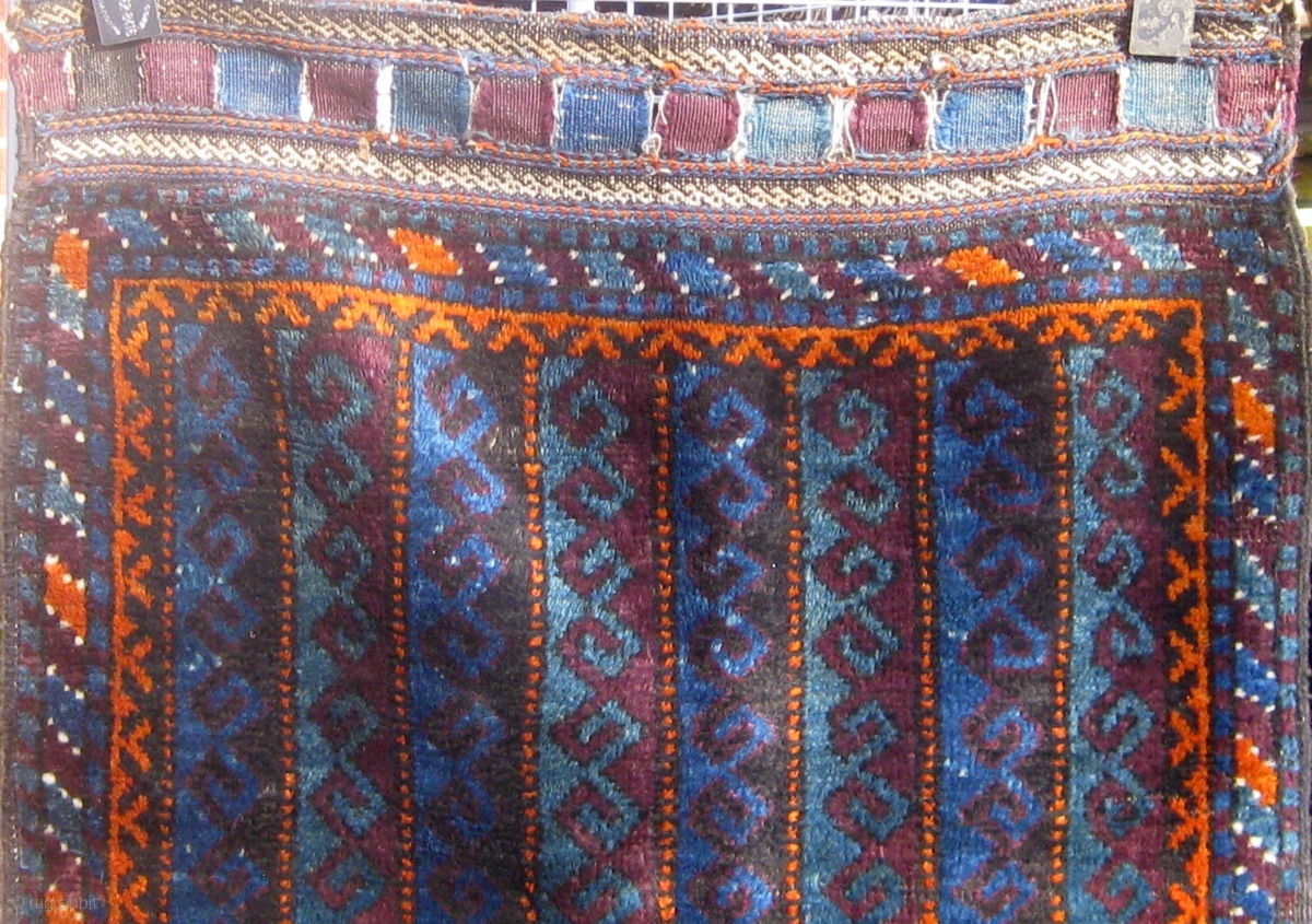 Very unusual antique Baluch bag front, last quarter of the 19th century, with an unusual array of deeply saturated natural colors including various shades of blue, green, aubergine, deep apricot, etc. Single wefted. 41" by 27". Small area of moth damage to the pile, easily restored, and some oxidation to the brown as expected. Luscious silky wool.