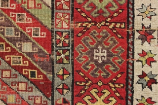 antique caucasian long rug, probably talish. Nice design with good colors featuring rich greens, multiple reds, light blues, and a deep purple. "as found", with wear, heavy black oxidation and some damage as shown. Some original selvage with characteristic talish structure. Rough but restorable and priced accordingly. ca. 1875. 3'1" x 8'1"